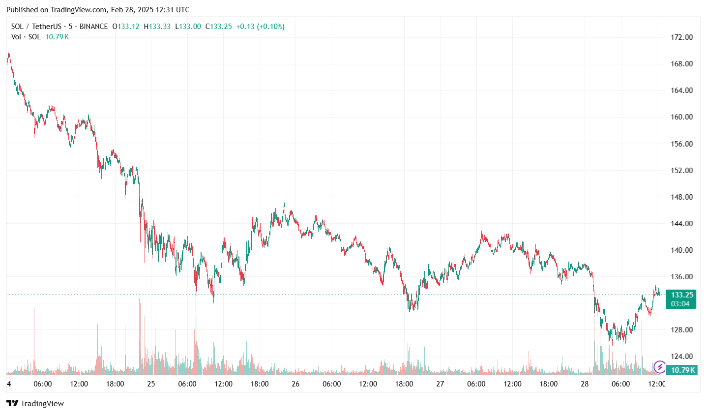 Tại thời điểm viết bài, giá Solana đang giao dịch quanh mức 133 đô la, giảm hơn 25% so với tuần trước.